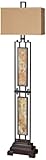 Superior craftmanship is exemplified on this Carolyn Kinder designed floor lamp. Suspended slabs of slate are surrounded by antique black metal. The rectangle box shade is a rusty beige linen fabric with natural slubbing that offers suberb lighting. Design by Uttermost. Slate, metal, resin construction. Beige, brown and black tones. Shade is rusty beige linen fabric with natural slubbing. Uses one 150 watt bulb (not included). 65" high.