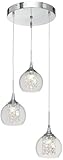 This set of three mini pendants has a modern look that's easy to clean and unquestionably hip. A chrome finish covers the canopy and hardware. Crystal strings are positioned neatly to surround and reflect the central halogen light while a clear glass rounded shape envelops the crystal. Chrome finish. Clear glass. Includes three 20 watt halogen bulbs. Each shade is 6" wide and 7" high. Canopy is 12" wide.